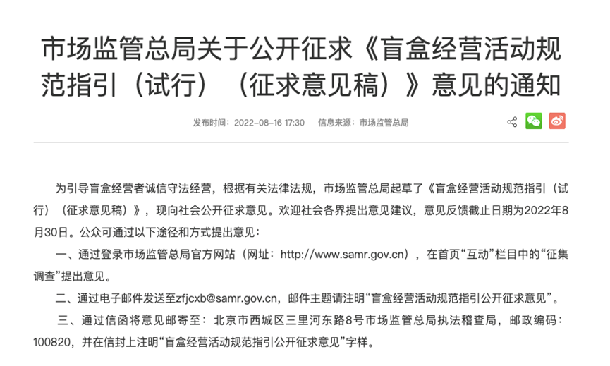 8月16日晚,国家市场监督管理总局在官网发布《盲盒经营活动规范指引(试行)》(征求意见稿)。