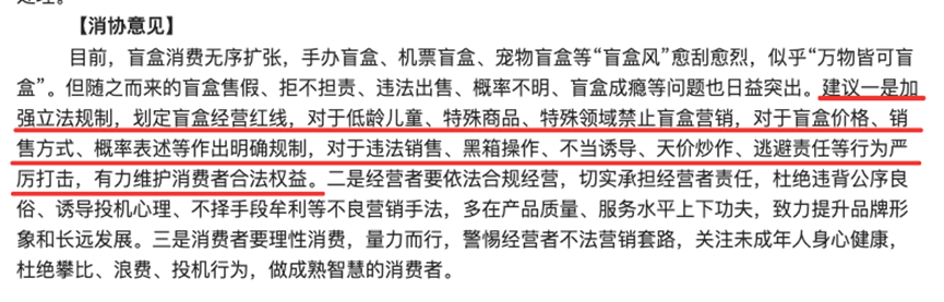 中消协建议加强立法规制,划定盲盒经营红线,对于低龄儿童、特殊商品、特殊领域禁止盲盒营销,对于盲盒价格、销售方式、概率表述等作出明确规制。