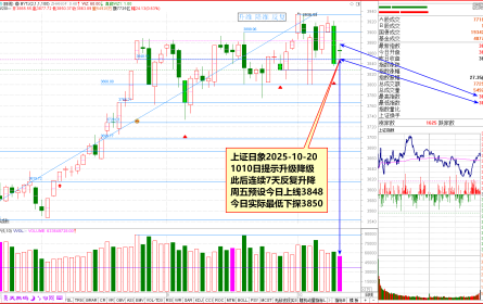一、请您验证: 1010日提示进入“升级、降级”阶段: 开盘于预设上线之上为升级(升维); 开盘于预设下线之下为降级(降维); 周五预设今日上线是3848点; 今日实际最低下探至3850点; 今日(1020)明显是升级行情,下线精准回踩预设上线: 从0408日至今日10 [详细内容]