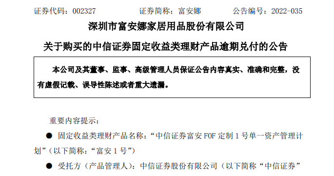 购买的中信证券上亿理财产品逾期未兑付8月23日早间,富安娜公告,2021年3月19日,富安娜以自有资金1.2亿元购买期限12个月的“中信证券富安FOF定制1号单一资产管理计划”(下称:“富安1号”),到期日为2022年3月19日。