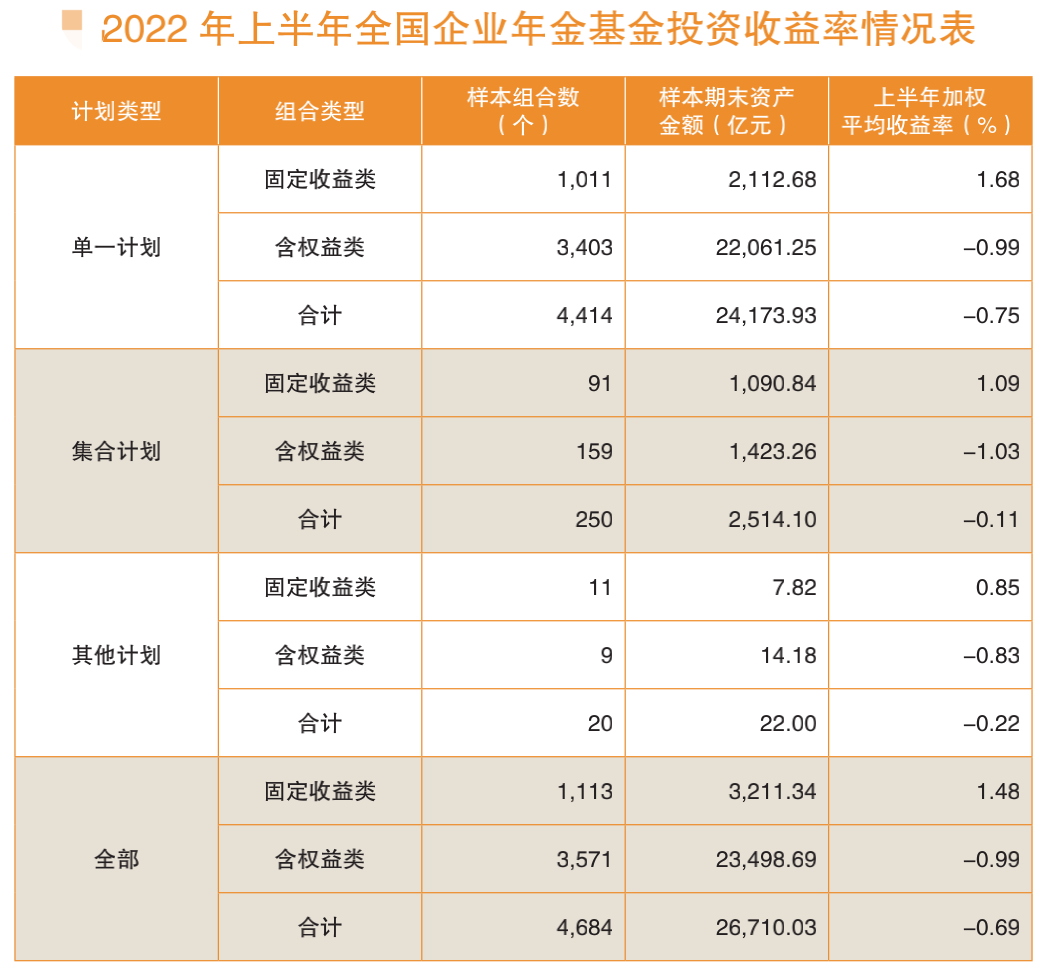 截至二季度末,企业年金基金单一计划资产金额2.42万亿,占据了基金绝大部分资产。单一计划整体上半年加权平均收益率为-0.75%,其中固收类组合收益率为1.68%,含权益类组合收益率-0.99%。 集合计划二季度末规模2514亿元,上半年加权平均收益率为-0.11%;其中固收类组合收益率1.09%,含权益类组合收益率-1.03%。