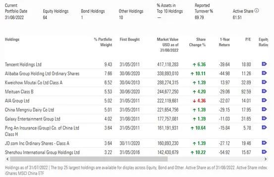 截图来自:晨星 富达国际旗下另一只中国股票基金对互联网股票的加仓幅度更大,腾讯控股获加仓的幅度超60%。晨星数据显示,截至8月底,富达国际旗下中国焦点基金的前十大重仓股分别为腾讯控股、建设银行H股、阿里巴巴、阿里巴巴ADR、中国人寿H股、招商银行H股、工商银行H股、百度ADR、联想集团、东风汽车H股。 8月期间,基金增持对其头号重仓股腾讯控股加仓61.18%持仓股份,期末持仓市值达1.63亿美元,同时基金将美股阿里巴巴移仓至港股,8月减持阿里巴巴ADR7.12%股份,同时增持港股阿里巴巴17.66%股份。建设银行、招商银行、工商银行等金融股也同样获基金增持不少股份。